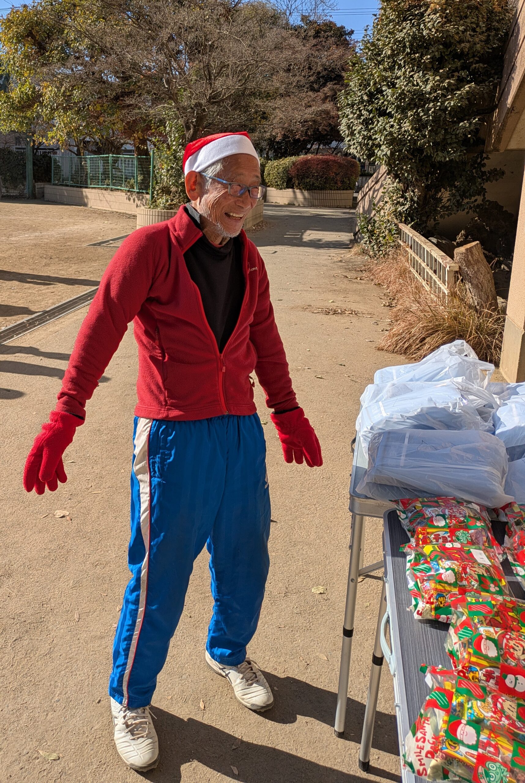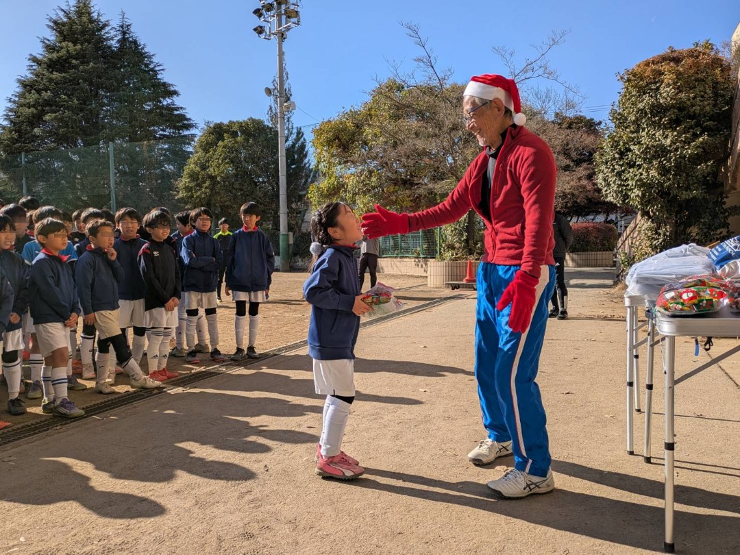2025年12月13日(土) 、冬の青空の下、北浦和小学校にてクリスマス会を開催しました。試合に行く学年もあったため、午前中にサンタ帽をかぶった団長から、クリスマスプレゼントが渡されました。一足早いプレゼントに団員のみんなは喜んでいました!
